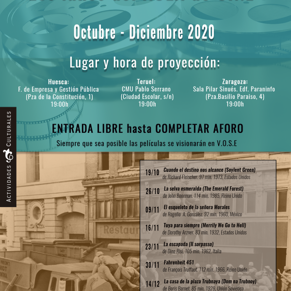 La temporada que iniciamos viene marcada de forma irremediable por la pandemia que estamos sufriendo. No por ello vamos a dejar este curso sin Aula de Cine, sin cultura, tan necesaria en cualquier momento y situación pero ahora más que nunca. Así, adoptamos las medidas de seguridad necesarias y cambiamos la estructura habitual de los ciclos temáticos que celebrábamos hasta ahora. Este año solo hacemos una sesión semanal, los lunes, dentro de lo que podemos considerar un único ciclo pero que al mismo tiempo reúne lo que ha caracterizado al Aula de Cine durante casi dos décadas: atender a toda la historia del cine, desde los orígenes hasta la actualidad, y ofrecer una amplia variedad de contenidos, miradas y procedencias. Todo ello dotado a su vez de una columna vertebral que sustenta la programación, consistente en películas que plantean futuros distópicos, así como obras con marcados mensajes ecologistas, que nos alertan de a dónde pueden llegar nuestras sociedades si no tenemos democracias sanas o no cuidamos nuestro sobreexplotado planeta. Un ciclo dentro del ciclo acorde con el espíritu crítico y reflexivo que siempre hemos defendido desde este espacio cinematográfico. A su alrededor encontraremos cine mudo, comedias, cintas habladas en español, cine negro, clásicos, cine asiático o europeo que, como siempre, nos permiten mostrar la riqueza expresiva del séptimo arte y, de paso, recuperar films ya conocidos por el aficionado, siempre disfrutables, y descubrir otros olvidados o desconocidos.
