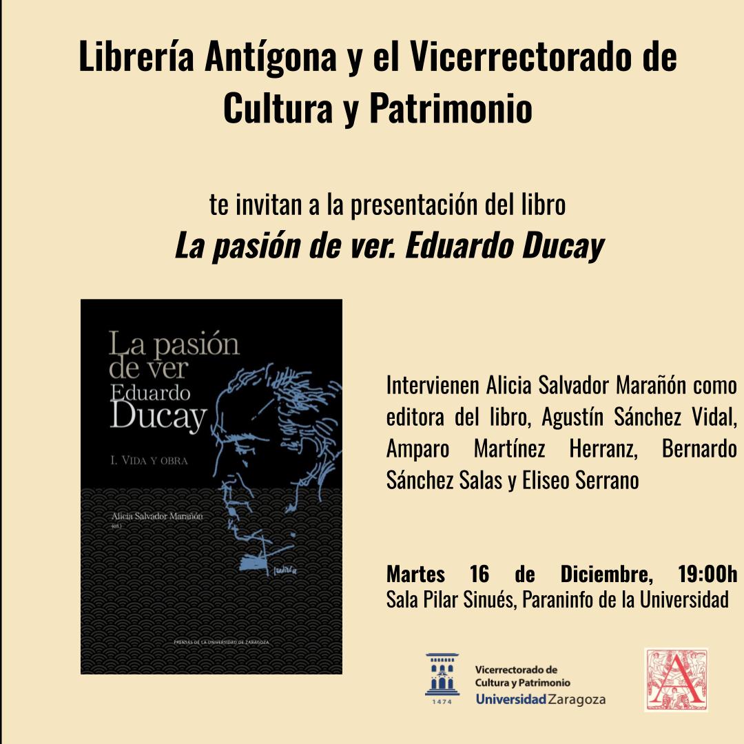 El martes 16 de diciembre a las 19:00h en la sala Pilar Sinués del edificio Paraninfo de la Universidad de Zaragoza, tendrá lugar la presentación del libro La pasión de ver. Eduardo Ducay, editado por Alicia Salvador Marañón.