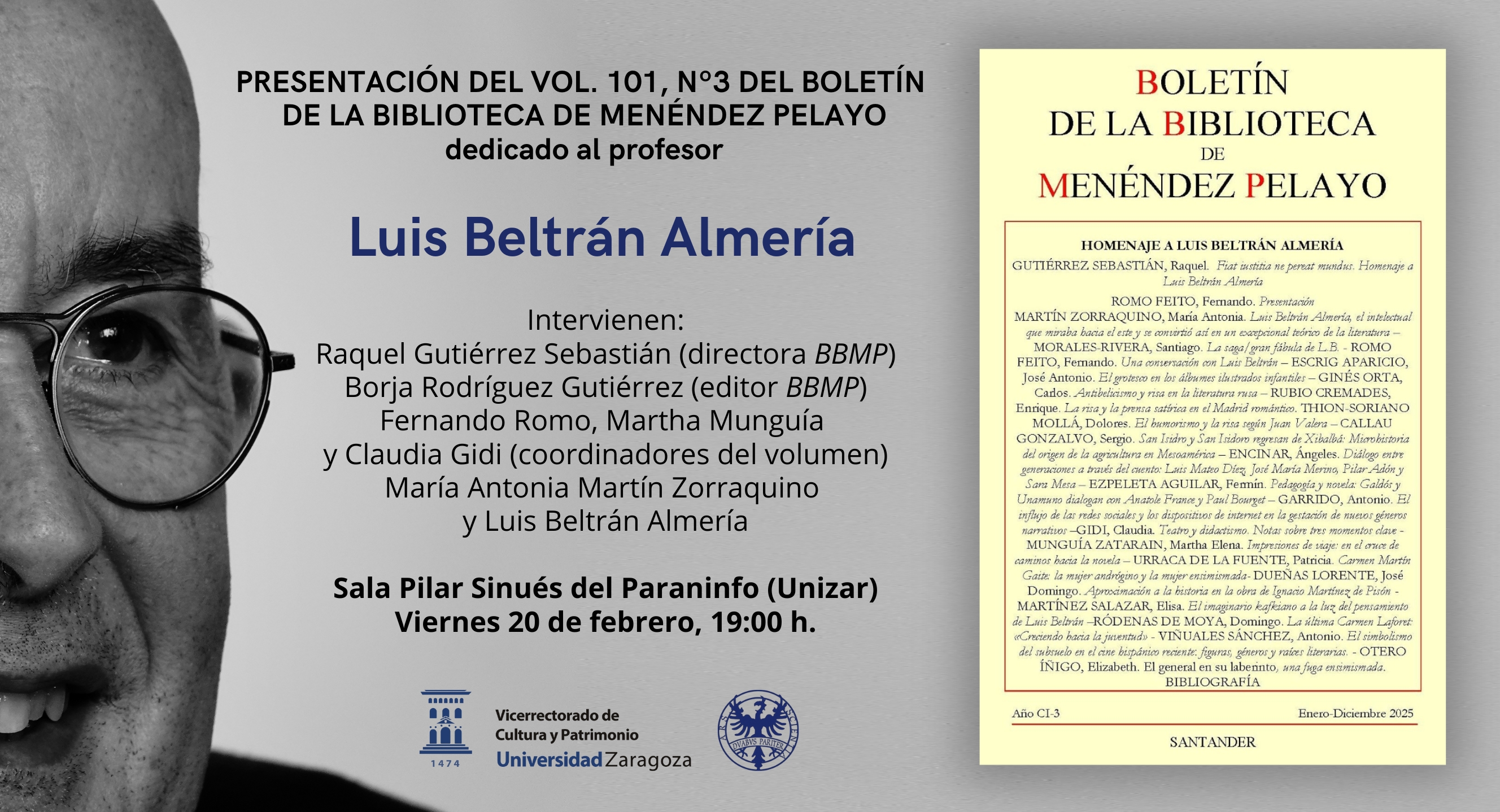 El viernes 20 de febrero de 2026, a las 19:00 h en la sala Pilar Sinués del edificio Paraninfo, se presentará el volumen 101, número 3, del Boletín de la Biblioteca de Menéndez Pelayo (BBMP), dedicado monográficamente al profesor Luis Beltrán Almería.