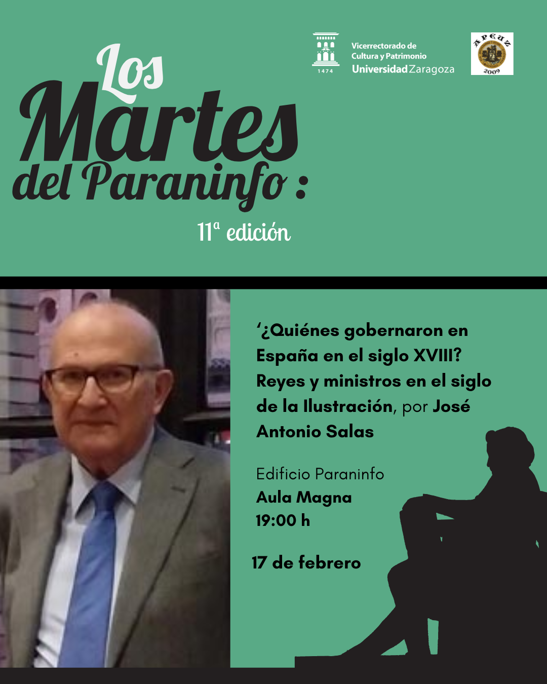 La conferencia titulada ¿Quiénes gobernaron en España en el siglo XVIII? Reyes y ministros en el siglo de la Ilustración será impartida por el profesor emérito José Antonio Salas el día 17 de febrero a las 19:00h en el Aula Magna del Paraninfo.