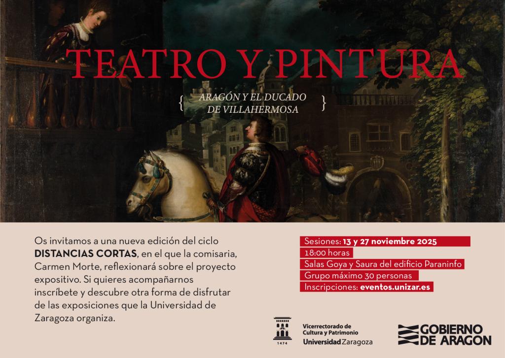 El Vicerrectorado de Cultura y Patrimonio de la Universidad de Zaragoza organiza una nueva edición del ciclo Distancias cortas, en torno a la muestra TEATRO Y PINTURA. ARAGÓN Y EL DUCADO DE VILLAHERMOSA, en el que la comisaria, Carmen Morte, reflexionará sobre el proyecto expositivo. Si quieres acompañarnos inscríbete y descubre otra forma de disfrutar de las exposiciones que la Universidad de Zaragoza organiza.