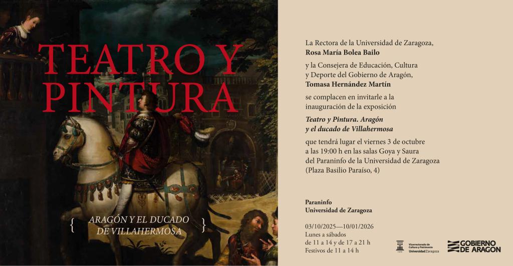 Teatro y pintura. Aragón y el ducado de Villahermosa inaugura la programación expositiva del recién creado Vicerrectorado de Cultura y Patrimonio de la Universidad de Zaragoza, marcando el inicio de una etapa que refuerza el compromiso de nuestra institución con la investigación, la conservación y la difusión del patrimonio cultural. Esta nueva denominación expresa con claridad la voluntad de situar el patrimonio en el centro de la acción cultural universitaria, con una mirada que integra pasado y presente, conocimiento y sociedad. En este marco, resulta especialmente significativa la colaboración con el Gobierno de Aragón, a través de su Dirección General de Cultura, que ha hecho posible el desarrollo de esta exposición.
