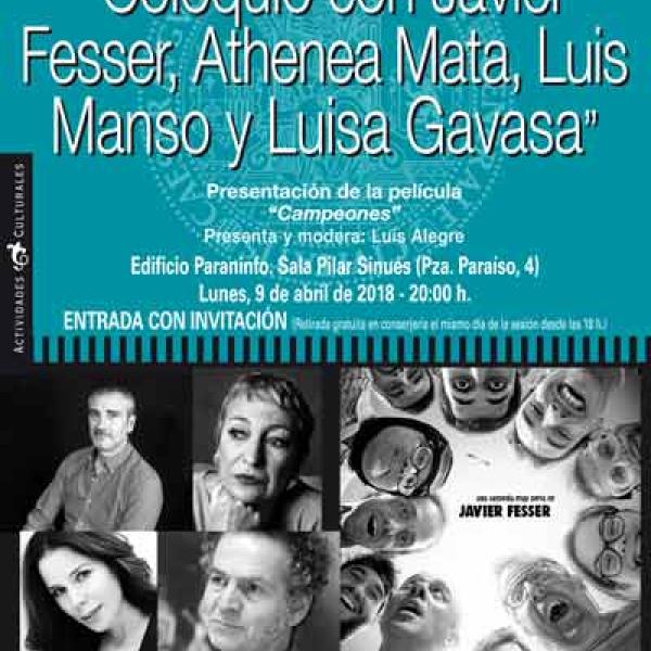 Javier Fesser, Luis Manso, Luisa Gavasa y Athenea Mata, director, actrices y productorde Campeones acudirán el lunes 9 de abril a Zaragoza para participar en la sesión 169 de La buena estrella, el ciclo de coloquios organizado por el Vicerrectorado de Cultura y Proyección Social de la Universidad de Zaragoza.