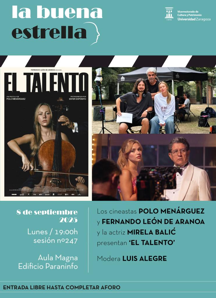 El lunes 8 de septiembre, los cineastas Fernando León de Aranoa y Polo Menárguez y la actriz Mirela Balic, intervendrán en la sesión 247 de “La buena estrella”, el ciclo de conversaciones organizado por el Vicerrectorado de Cultura y Patrimonio de la Universidad de Zaragoza.